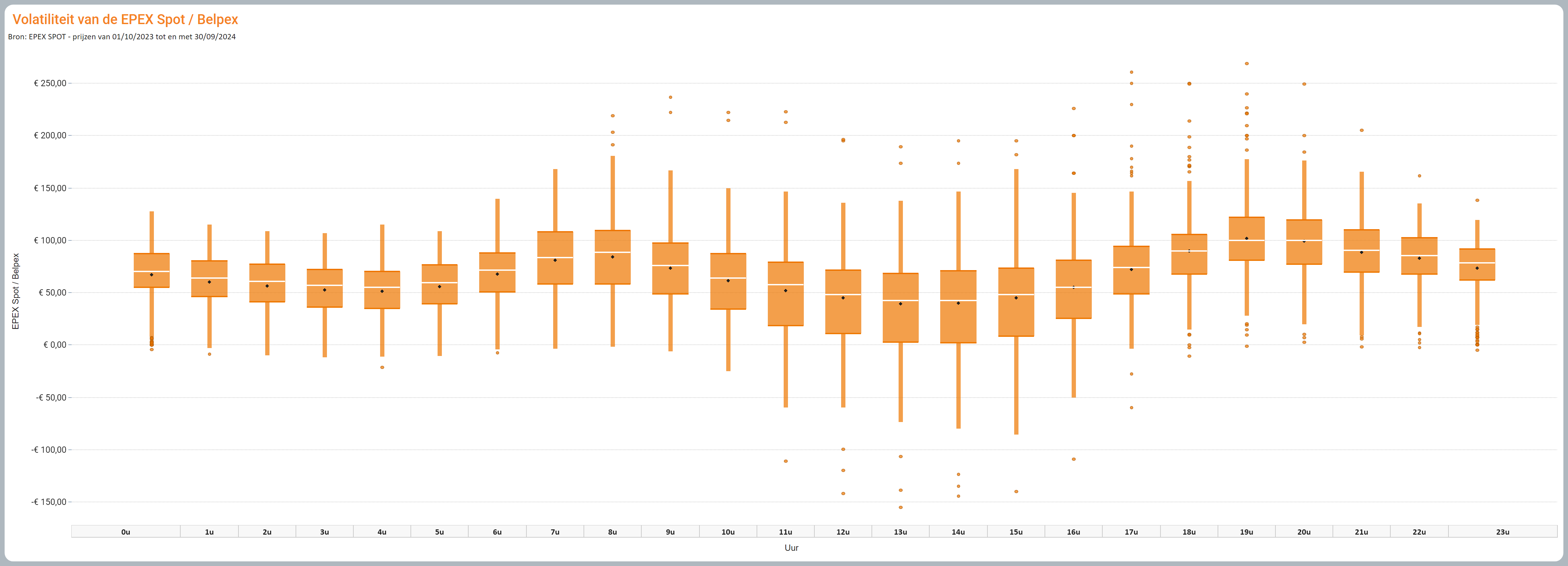 - La variabilité des prix pour cette heure au cours de cette période, basée sur le premier et le troisième quartile (indiquée par les boîtes et les lignes verticales – plus la boîte et/ou la ligne verticale est longue, plus la variabilité est élevée)