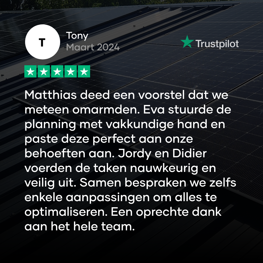 In jouw energieproject is een betrouwbare partner aan jouw zijde een must. Enerzijds zorgt jarenlange ervaring in de sector voor een meerwaarde in technische kennis. Anderzijds garandeert het een ijzersterk team die instaat voor een persoonlijke service.